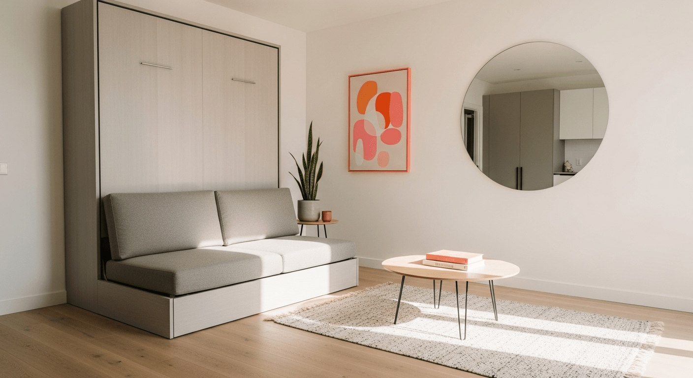 This 600 sq. ft. 1BHK apartment gut renovation was an exercise in space optimization. The design revolves around custom, transformable furniture, including a Murphy bed that reveals a full-sized work desk and a collapsible dining island in the kitchen. We used a light, airy palette with strategic pops of color and clever lighting to make the space feel larger. The primary challenge was the building’s old plumbing and wiring; we had to meticulously re-route all services within the compact ceiling and wall cavities to achieve a clean, modern finish.