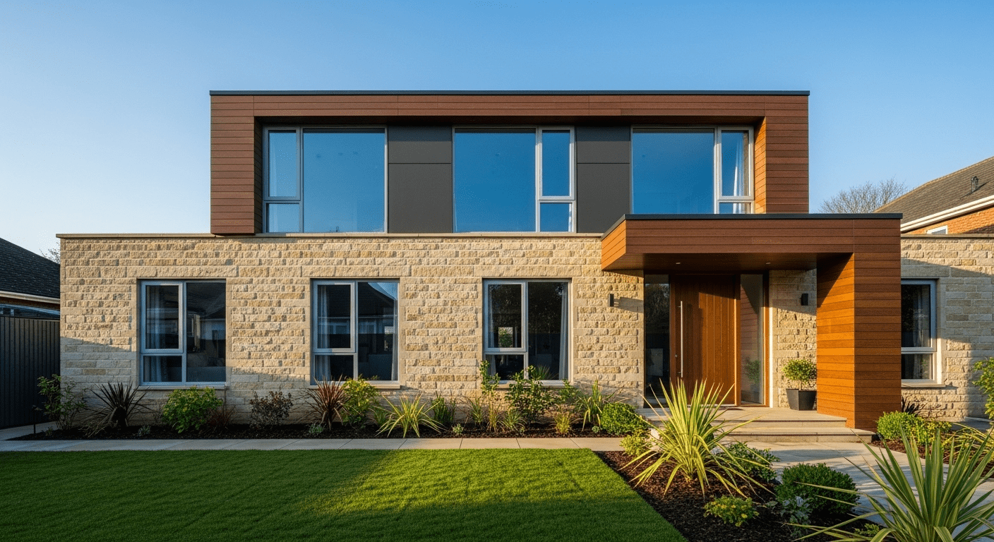 This project focused on the architectural facade uplift and landscape design for a 4,000 sq. ft. plot. The exterior renovation included adding a modern stone-cladding and wood-finish HPL sheet elevation. The landscape design incorporates a lush lawn, a paved patio for outdoor seating, and a perimeter of low-maintenance, drought-resistant plants. A key challenge was solving the plot’s water-logging issue during monsoons, which we resolved by designing an effective French drain system concealed beneath the garden.