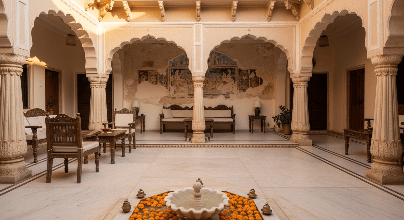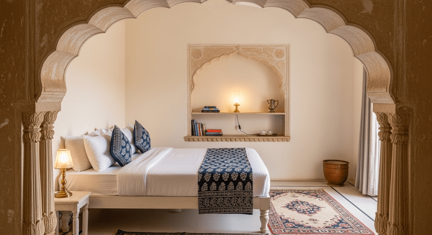 This project involved the interior design and spatial planning for a heritage property to function as a charming bed-and-breakfast. The design brief was to create an authentic “Udaipur experience” by blending traditional Rajasthani decor with modern comforts. We restored original arches and niches, using local handicrafts, block-printed textiles, and terrazzo flooring. The main challenge was to discreetly add en-suite bathrooms to each room without altering the original structure, which we achieved by designing compact, prefabricated bathroom pods.