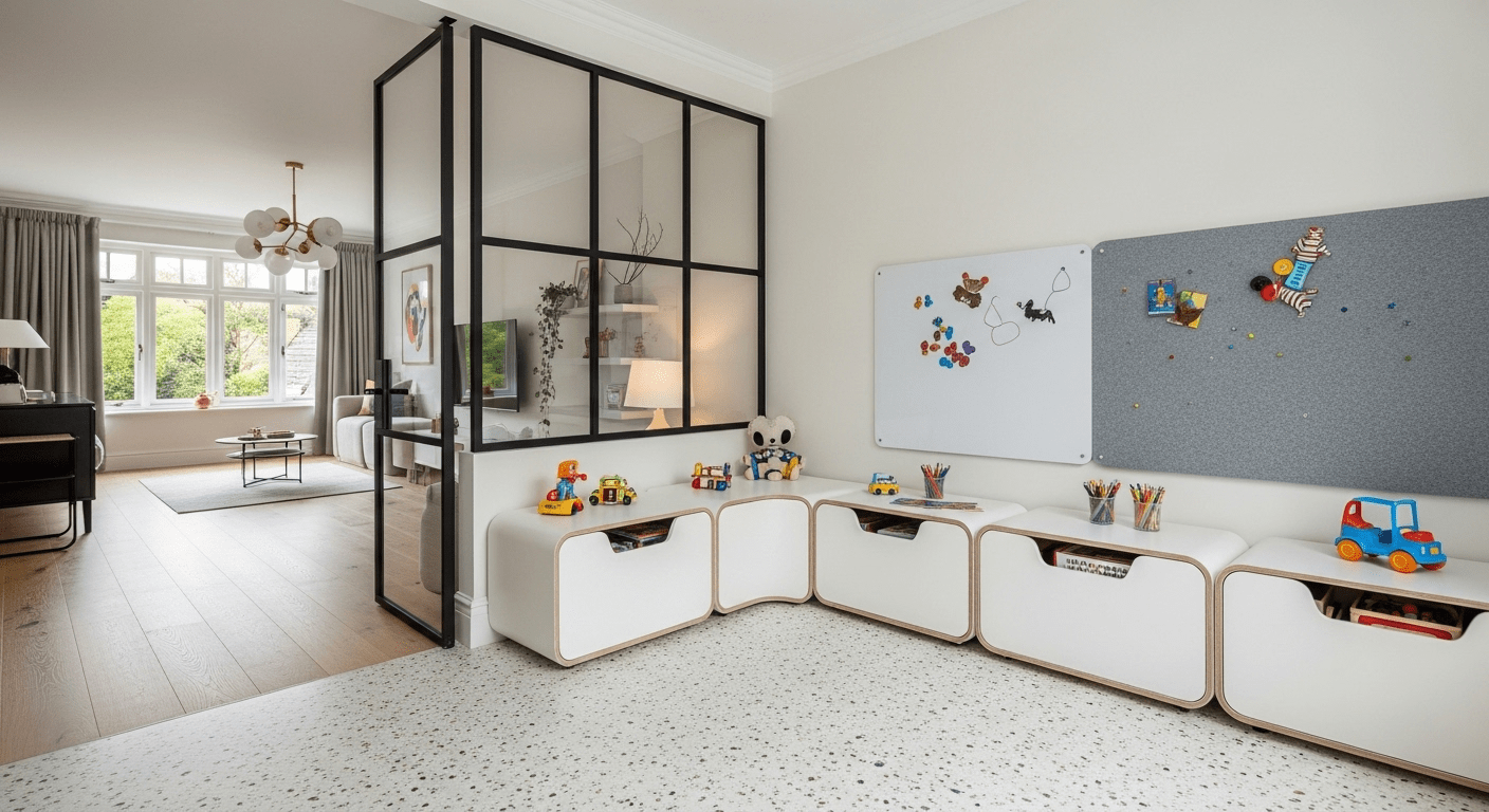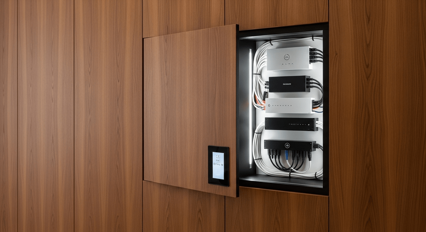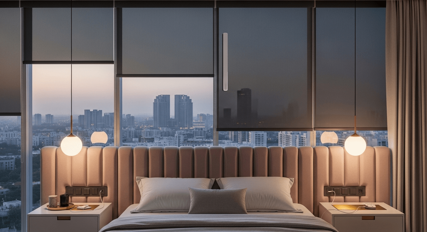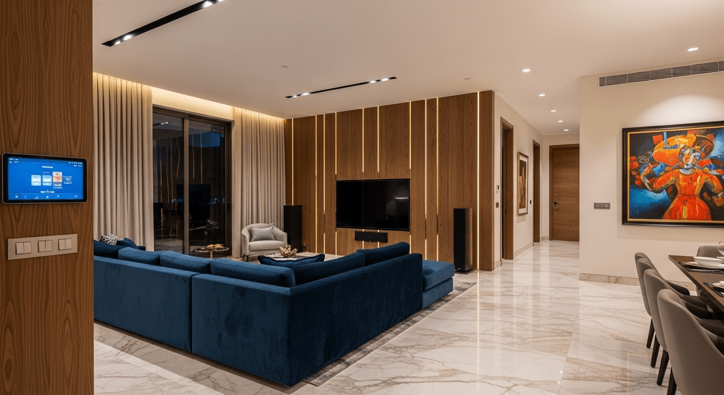 This 3,500 sq. ft. 4BHK apartment interior was designed to exude modern luxury with a focus on seamless smart-home integration. The design palette includes Italian marble flooring, bespoke veneer paneling, and accents of brass and rose gold. A key client requirement was a sound-proof home theater and a dedicated play-zone for their two young children. The primary challenge was concealing the extensive wiring for the automation and AV systems, which we resolved by creating intelligent service niches and using custom-designed furniture to hide conduits.